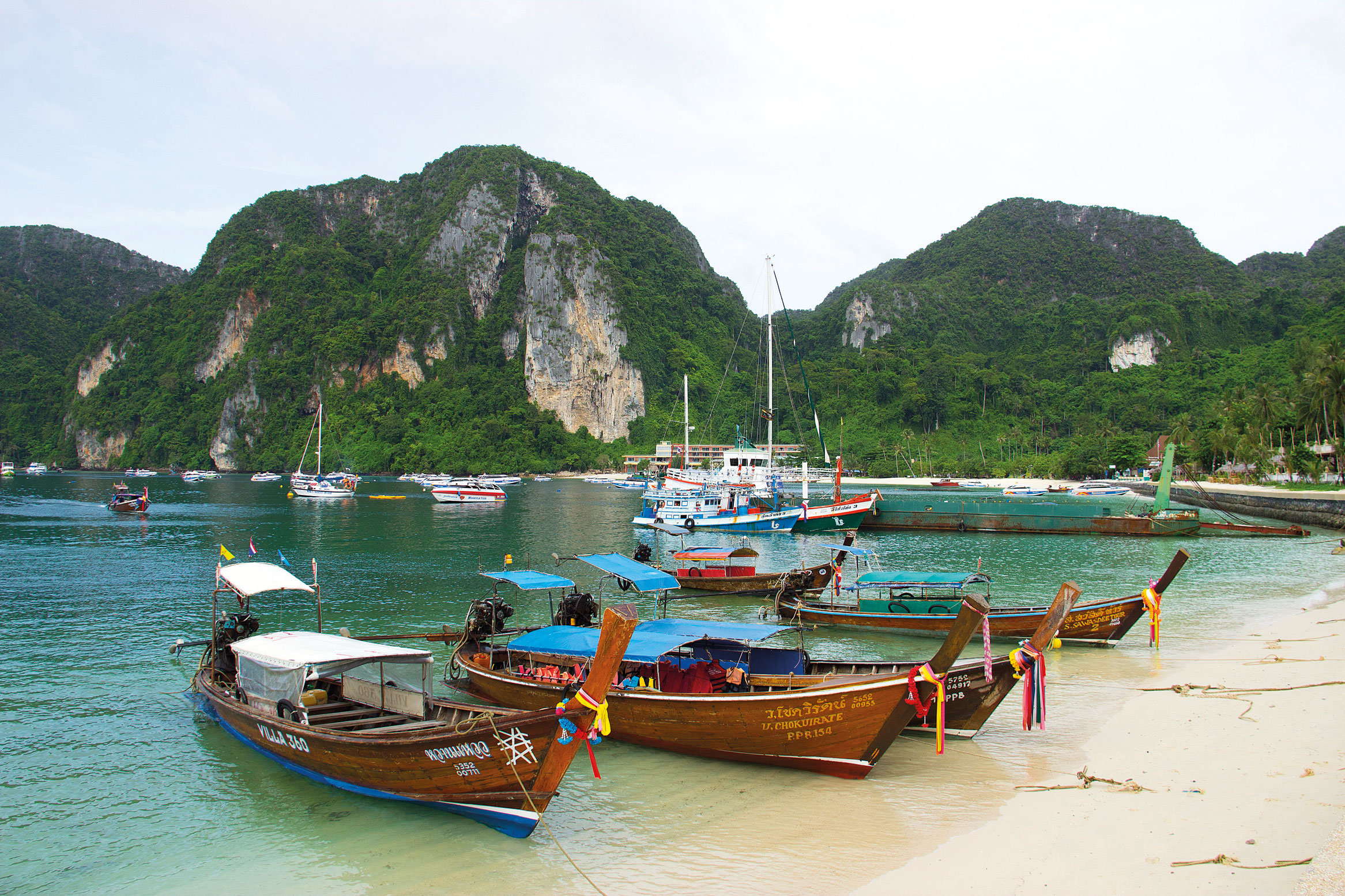 Po nakoupení zásob v místním supermarketu jsme vyrazili jižním směrem na přibližně 80km plavbu na ostrovy Phi Phi, které patří k nejpříhodnějším místům Andamanského moře pro podmořské potápění i šnorchlování (hloubka 35 m s viditelností do 30 m). Donedávna byly Ko Phi Phi nazývané jako poslední zapomenutý ráj na zemi – žádní lidé, jen úchvatná příroda, modré moře, vápencová skaliska a divoká džungle. Změna přišla až po uvedení filmu Pláž, který udělal celému souostroví tu nejlepší reklamu. Úchvatná příroda zůstala, jen turistů rapidně přibylo. Na Ko Phi Phi Don vyrostly hotelové komplexy a restaurace. V roce 2004 udeřila tsunami, která vymazala z povrchu zemského 70 % budov. Dnes již tuto smutnou událost připomínají pouze fotografie v místních restauracích. Vše bylo znovu velmi rychle postaveno a ostrov se stal kultovním místem. Na Ko Phi Phi nejezdí automobily, vše se přiváží lodí a po ostrově distribuuje pomocí vozíků. Po prohlídce promenády v zálivu Ao Ton Sai a skvělé večeři složené z thajských specialit v místní restauraci se vracíme na loď, kde zůstáváme na kotvě přes noc.